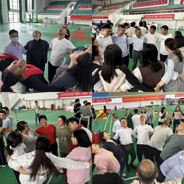 全体教职工被随机分为7支队伍,并迅速投入到一系列精心设计的素质拓展项目中。热身运动“花开花落”环节迅速消除了彼此的陌生感,现场气氛瞬间被点燃。