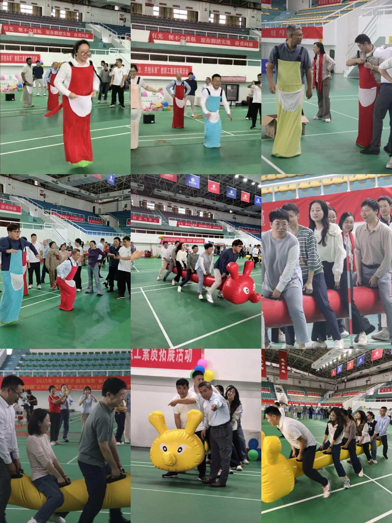 随后的团队竞赛环节更是精彩纷呈。“袋鼠跳”项目中,老师们化身成一只只“袋鼠”,奋力向前跳跃,完成一次又一次接力运球。赛场上既有身轻如燕的敏捷身影,也有不慎“出糗”的欢乐瞬间,在队友和对手的加油呐喊声中坚持跳到终点。“毛毛虫”项目要求队员们通力协作,考验着团队的耐心与协调;“队长赢福利”极大地激发了老师们的集体荣誉感。活动中,加油声、欢呼声、欢笑声此起彼伏,平日里在讲台上严谨授业、在实验室里潜心钻研的教师们,此刻都化身为了为团队荣誉而战的“运动员”,展现出了活力四射、昂扬向上的另一面。