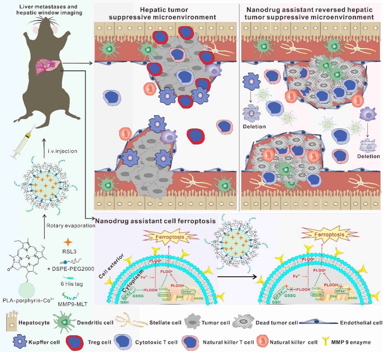 肝转移是多种恶性肿瘤患者死亡的重要原因之一,具有微环境复杂、治疗耐受强、预后差等特点。针对现有治疗手段在肿瘤穿透性、靶向性和安全性等方面存在的不足,研究团队从肝转移微环境特征入手,系统分析了铁死亡相关分子和基质金属蛋白酶在肝转移中的作用。研究发现,SLC7A11和MMP-9在肝转移组织中高表达,并与患者不良预后密切相关,提示二者可能是干预肝转移进展的重要靶点。