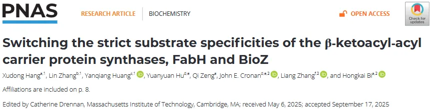 11月3日,海南医科大学生命科学与医学技术学院毕洪凯教授团队联合上海交通大学、美国伊利诺伊大学香槟分校等单位,在国际权威学术期刊《PNAS》(美国国家科学院院刊)上在线发表题为“Switching the strict substrate specificities of the β-ketoacyl-acyl carrier protein synthases,FabH and BioZ”(β-酮脂酰-酰基载体蛋白合成酶FabH和BioZ底物特异性的互换)的研究论文。