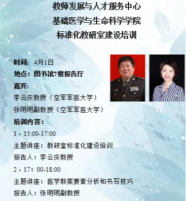 为更好的促进学校“更名”工作,助推我校教研室标准化建设,提高人才培养质量,我校特邀请教育部特聘教授、中国解剖学会副理事长、空军军医大学梁銶琚脑研究中心主任李云庆教授以及空军军医大学基础医学院人体解剖与组织胚胎学教研室张明明副教授为我校教师进行标准化教研室建设的培训。本次活动由教师发展与人才服务中心举办,基础医学与生命科学学院承办。各教研室、实验室主任、副主任、教学骨干及教学秘书参加了此次培训。2...