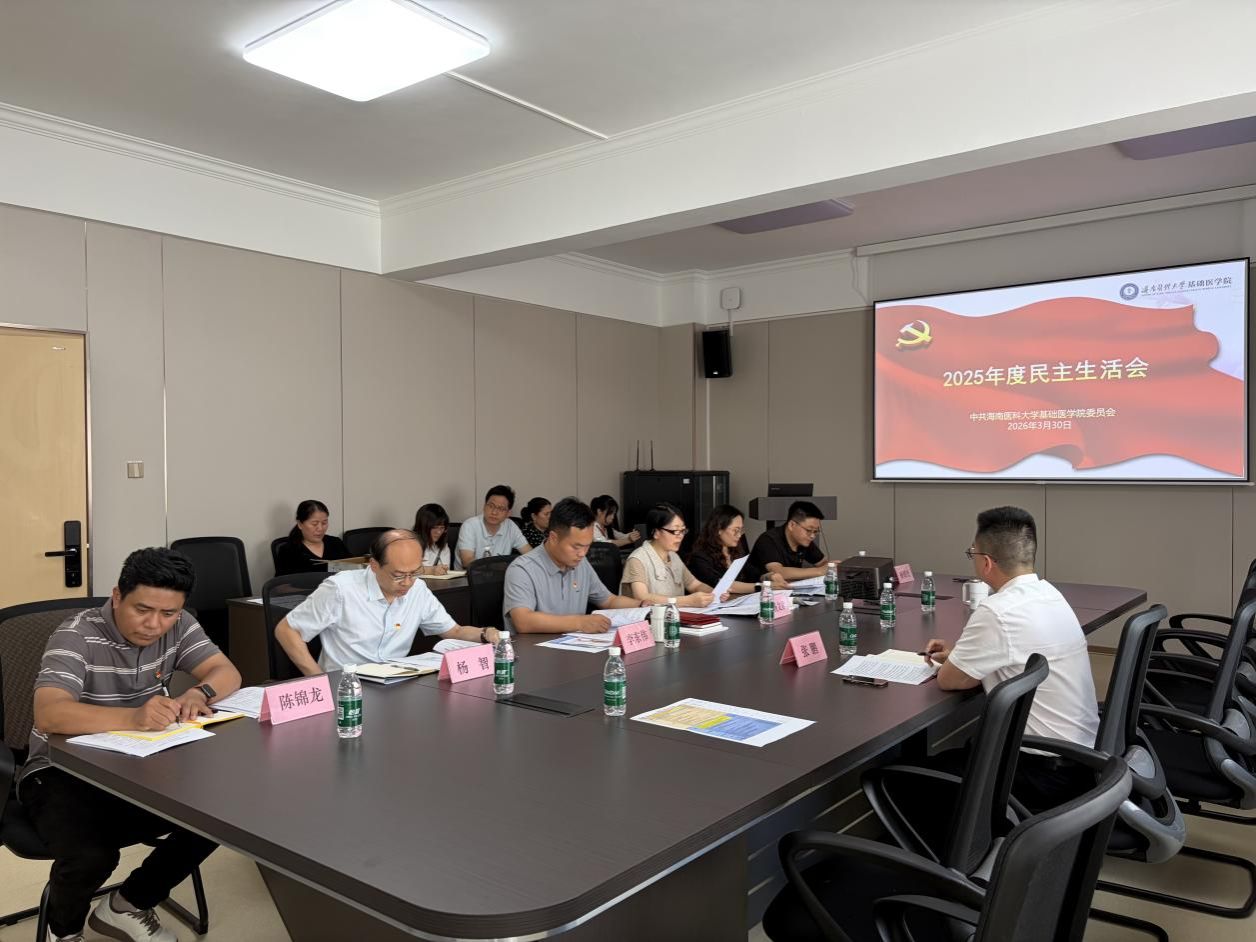 2026年3月30日下午,基础医学院党委在润深楼南306会议室召开学院2025年度民主生活会。学校党委组织部副部长张鹏到会指导并作点评讲话。学院党委书记杨文君主持会议,其他学院党委班子成员参加会议,学院纪委委员、办公室工作人员、三级单位代表列席会议。