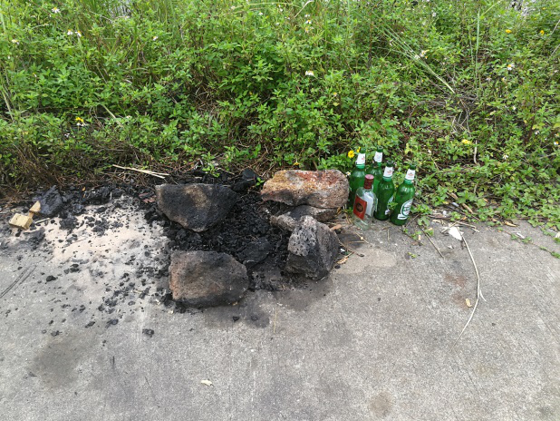 美舍河边每隔二十米就可以看见禁止乱丢垃圾的牌子,但居民们好像都对其视而不见,路上随处可见塑料袋子,酒瓶和众多的槟榔袋子。更有许多居民在河边烧烤,造成了很大的污染。