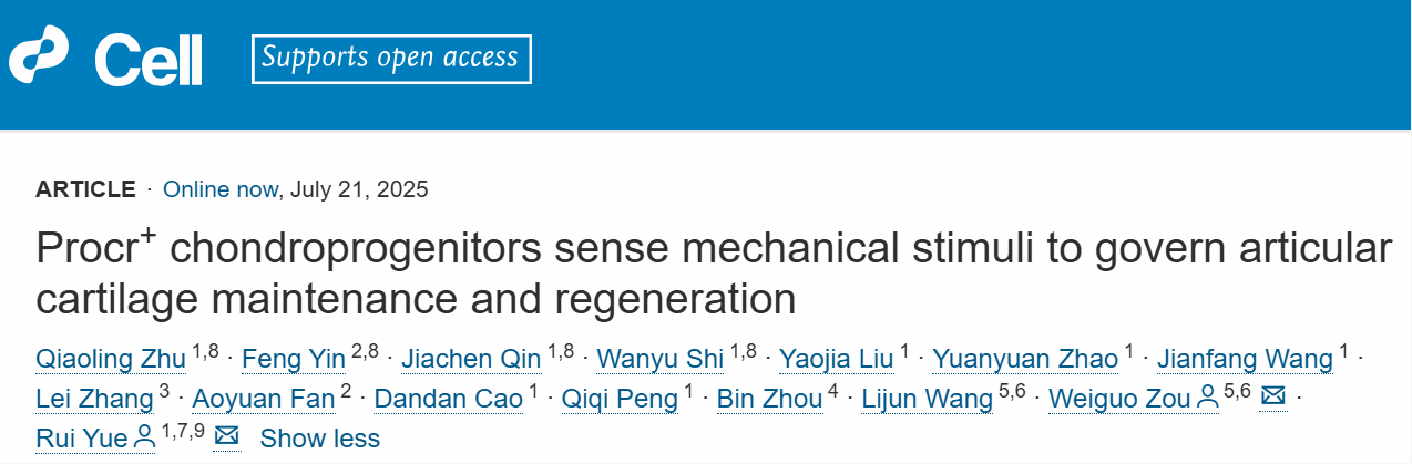 2025年7月21日,同济大学生命科学与技术学院、附属东方医院岳锐教授课题组联合海南医科大学邹卫国教授课题组在Cell在线发表了题为Procr+ chondroprogenitors sense mechanical stimuli to govern articular cartilage maintenance and regeneration的研究论文。该研究首次发现了对机械力刺激敏感的Procr+软骨祖细胞,并证明其不仅对成体关节软骨稳态维持至关重要,而且在关节损伤后显著促进软骨细胞再生,提示其有望成为治疗OA等退行性骨科疾病的新一代种子细胞。