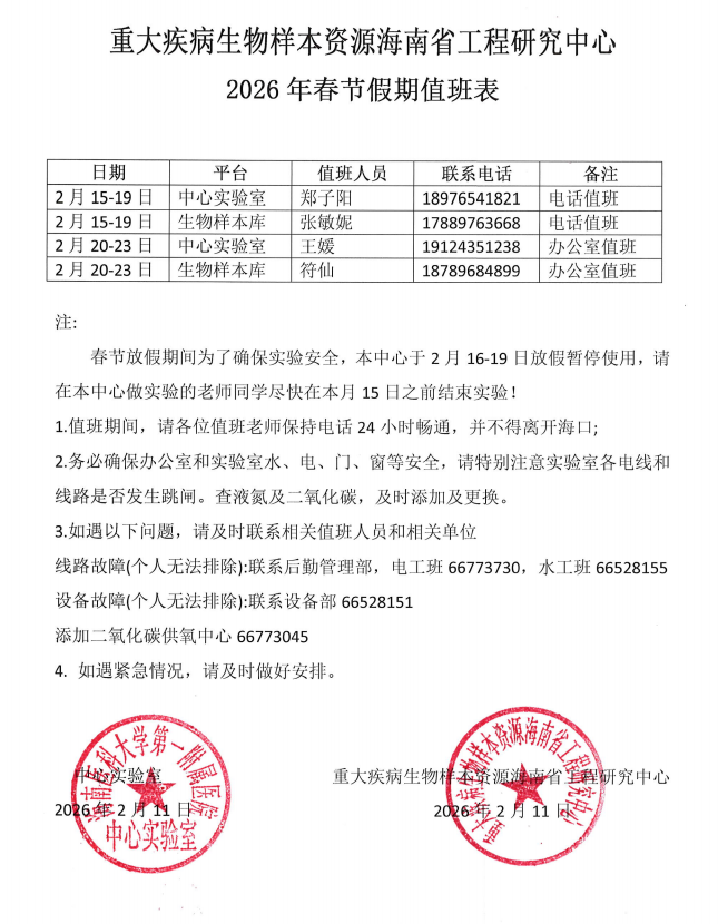 重大疾病生物样本资源海南省工程研究中心2026年春节假期值班表