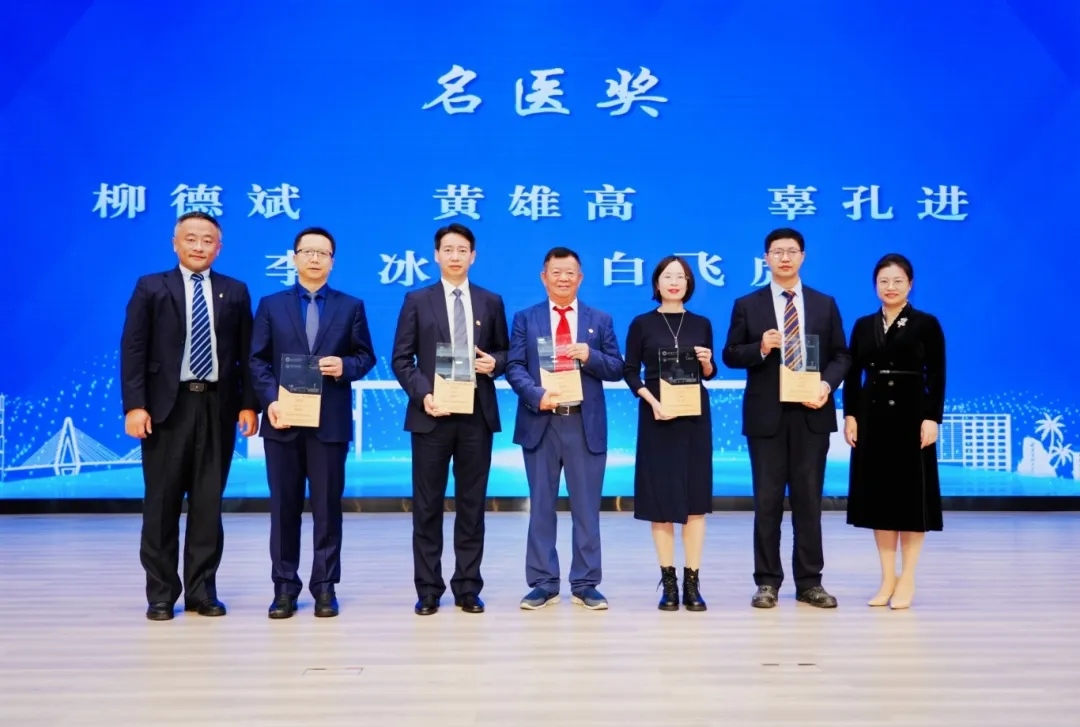 名医奖由海南医科大学附属海南医院柳德斌,第一附属医院黄雄高、辜孔进,第二附属医院李冰、白飞虎等五位医师荣获。副校长曾敏与宋天骏副总裁共同为名医奖获得者颁奖。