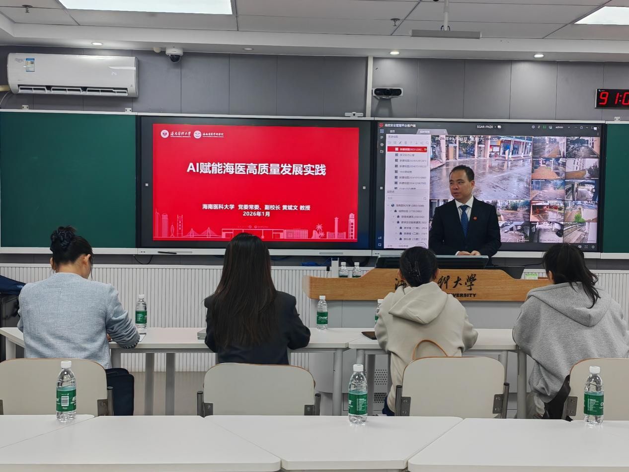 会上,黄斌文以《AI赋能海医高质量发展实践》为题,向调研组汇报了学校数字化建设进展。他指出,学校以“加强数字化顶层统筹设计,不断探索将大数据、人工智能等新一代数字技术与教育教学科研管理全过程深度融合”为核心理念,数字化建设实现从“数字拓荒”到“数字破天荒”的转变,在数字基础设施建设、应用系统和数据中心建设、AI赋能有组织科研和数字化教学应用、网络安全和数据安全等方面取得了一系列突破,获得认可。