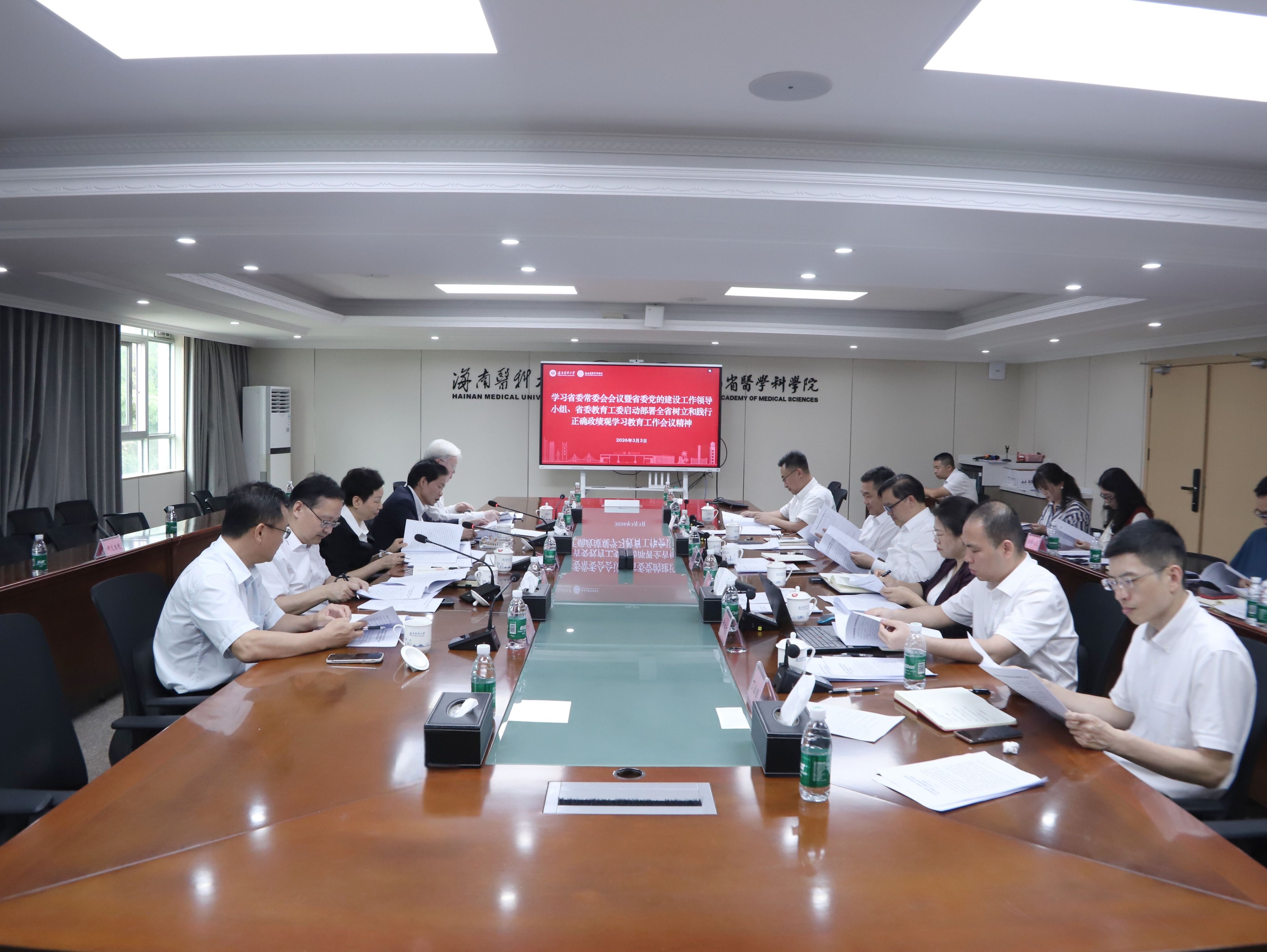 3月3日上午,海南医科大学党委召开会议,深入学习贯彻习近平总书记关于树立和践行正确政绩观的重要讲话和重要指示精神,传达学习中央党的建设工作领导小组会议、省委常委会会议暨省委党的建设工作领导小组会议和省委教育工委部署启动树立和践行正确政绩观学习教育工作会议精神,部署我校学习教育工作。学校领导班子全体成员参加会议,党委书记张彩虹主持会议。