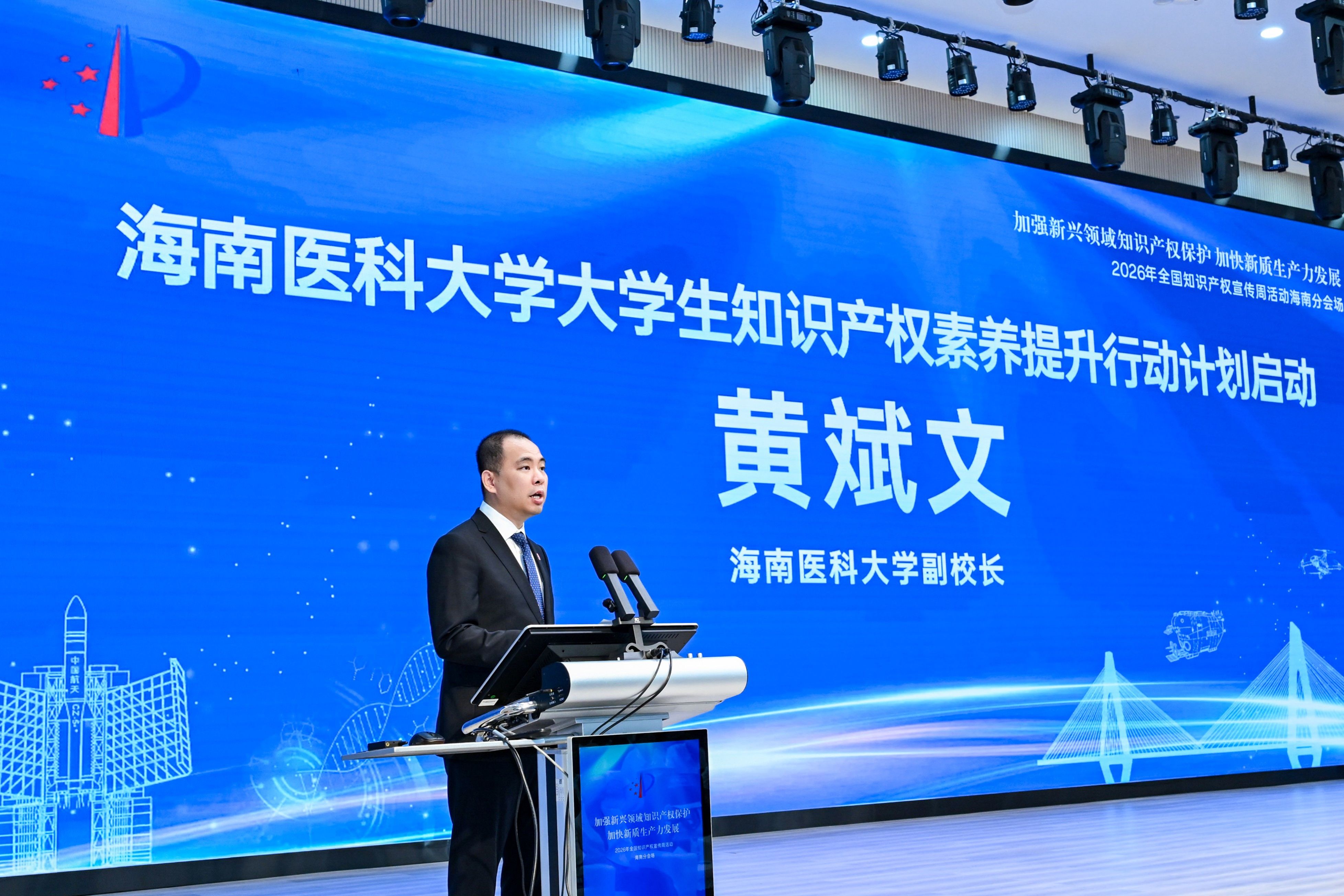 黄斌文宣布启动“海南医科大学大学生知识产权素养提升行动计划”。他指出,该计划将依托学校知识产权信息服务网点建设优势,通过课程融入、案例教学、实践活动与竞赛,引导师生树立尊重知识、崇尚创新、诚信守法、重视成果保护的正确理念,全面提升在校生的知识产权意识和创新能力,持续完善校内知识产权全链条育人体系,为自贸港培养复合型医学创新人才夯实基础。