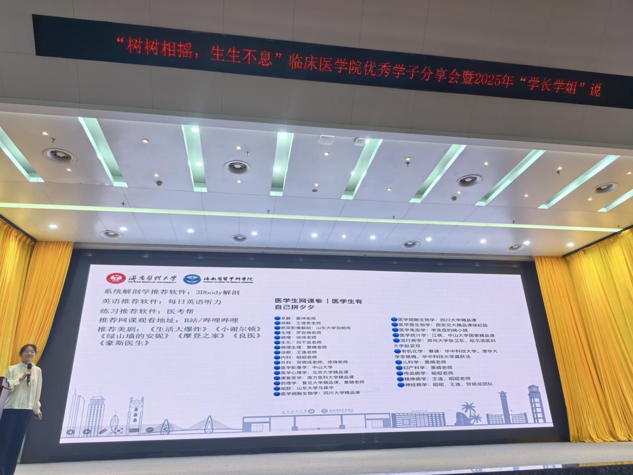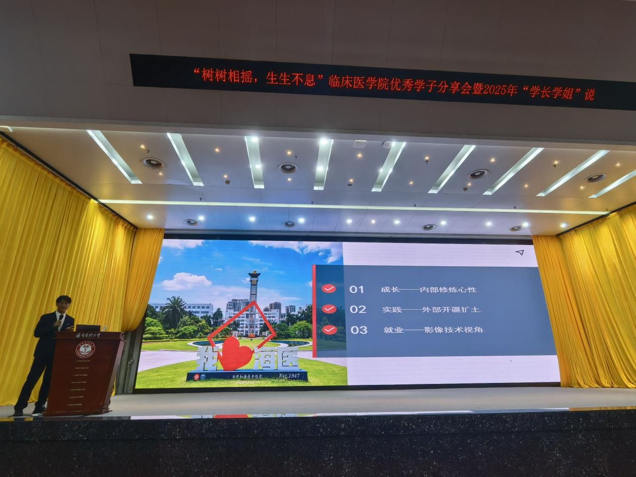 金秋送爽,丹桂飘香,薪火相传,筑梦启航。10月23日晚,临床医学院在立德厅举办“树树相摇,生生不息”优秀学子分享会暨2025年“学长学姐说”活动。本次活动作为新生入学教育的重要一环,特邀五位在学业科研、临床实践、综合素质等方面表现突出的学长学姐,与现场四百余名大一新生展开深入交流,共同谱写了一场关于成长、关于梦想、关于传承的青春盛会。