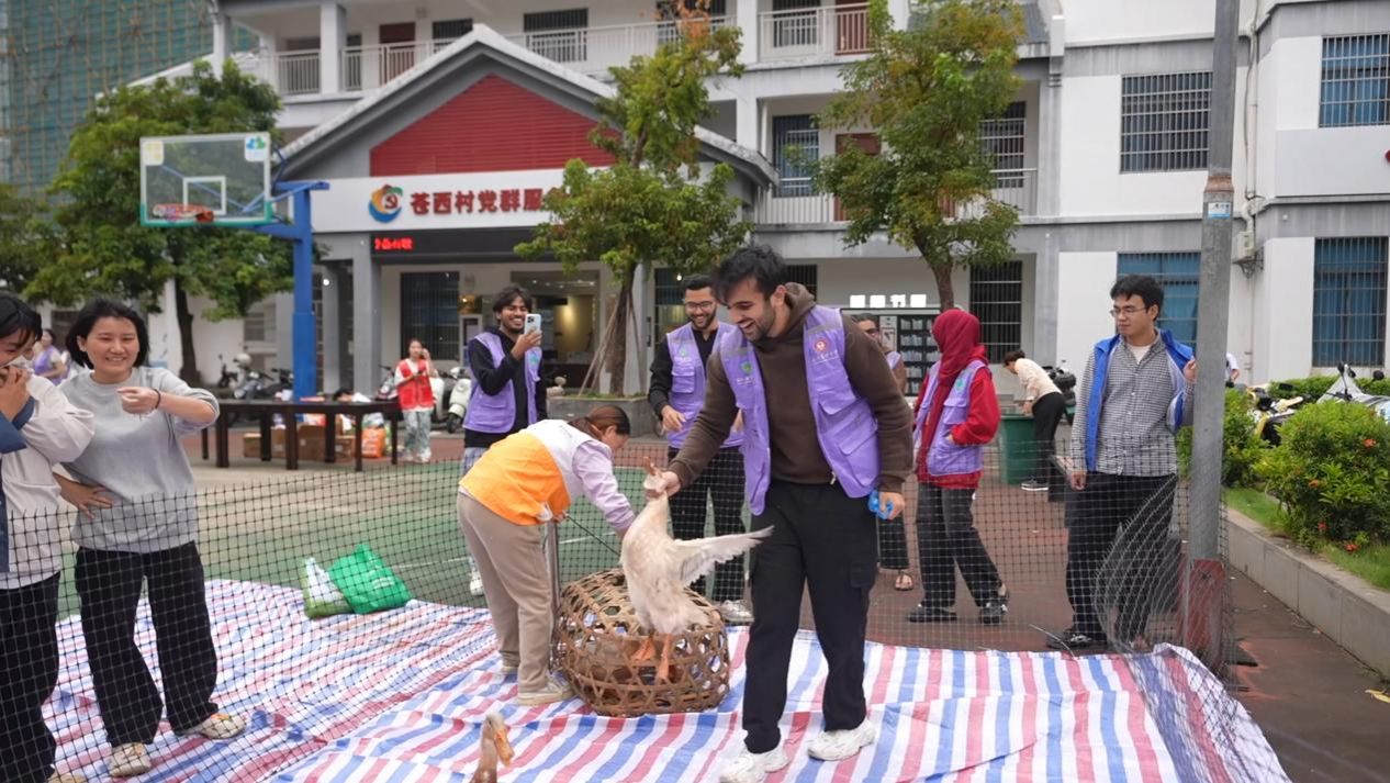 文艺汇演落幕,趣味游园活动随即热闹开启。国际志愿团队的留学生们早已按分工抵达各个游戏区,用行动守护长者的游园乐趣。在“趣味保龄球”区,巴基斯坦籍志愿者程飞飞(ARSHAD NIMRA)正协调其他两位志愿者们忙着摆放保龄球道具。看到78岁的张奶奶想参与却因行动不便犹豫时,她立刻上前扶住奶奶的胳膊,耐心讲解规则:“奶奶,您拿着这个球,轻轻往前推就好,我帮您扶着。”在她的鼓励下,张奶奶成功击倒3个球,开心得连连拍手,程飞飞也跟着笑起来:“奶奶您真棒!’‘小球‘夹’好运”区里,巴基斯坦籍志愿者陆则一(BILAL HAMMAD)默契配合小朋友一起拿起筷子夹小球,佐雅(CHAUDHARY ZOYA)举起印章,在卡券上认真盖下打卡印记,还不忘用手比个“耶”的手势。最热闹的“套鸭子”区,巴基斯坦籍志愿者罗彬(KHALID BILAL BIN)、世杰(MUNEER SIRAJ)严格把控秩序:罗彬在场地外围划定排队线,场地内把控鸭子行走路线,用中文和手势引导长者按顺序参与;世杰则负责发放套圈,还特意提醒“每人3个圈,慢慢扔,看准了再投”。而在拍照打卡区,老挝籍志愿者康善(CHONGCHUEKENGTHOR KAOXOUA)和杨颖(PHONGMANY SOUNITA)、柬埔寨籍志愿者宋碧妮(SVAY KUNTH PIDOR),成了居民们的“专属摄影师”。康善举着手机,耐心帮长者调整姿势,还教长者比“爱心”手势;宋碧妮则拿着“重阳安康”“敬老爱老”的手举牌,帮长者搭配拍照道具,偶尔还会用老挝语、柬埔寨语说一句“身体健康”“节日快乐”,引得长者一阵好奇声“小姑娘,你说的是什么呀?真好听”,现场笑声不断。在便民义诊区,国际志愿团队的留学生们充分发挥医学专业优势,协助苍西社区卫生服务站的医护人员开展服务。