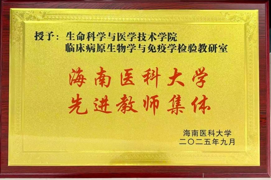 在2025年教师节表彰热潮中,生命科学与医学技术学院临床病原生物学与免疫学检验教研室,凭借在教学育人与科研领域的扎实耕耘,获“海南医科大学先进教师集体”称号。这不是学校对教研室工作成效的高度认可,是对团队教师长期扎根教育一线、深耕科研前沿、默默奉献担当的肯定。