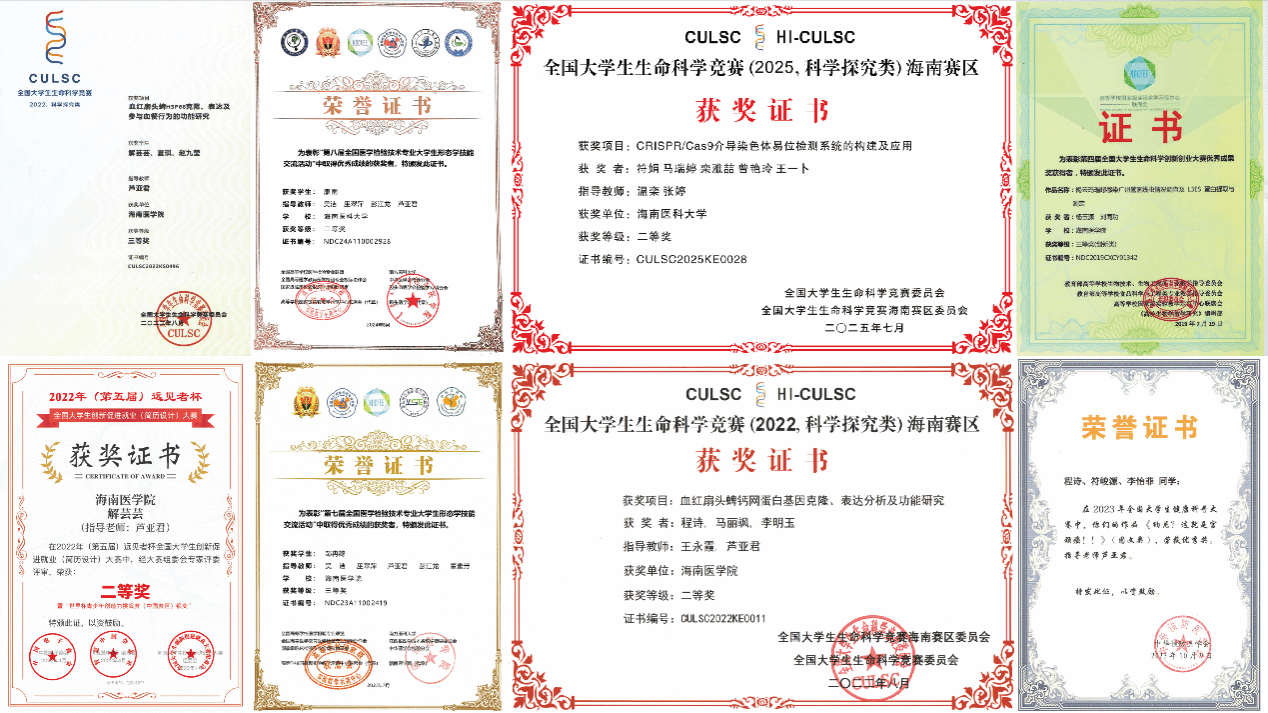 教研室坚持“以赛促学、以研育人”,为学生搭建多元化成长阶梯。在学科竞赛中,教研室教师组建专业指导团队,制定个性化辅导方案,从理论知识梳理到实操技能打磨,从项目思路优化到答辩技巧指导,全程跟进、精准发力,助力学生在各类赛事中屡创佳绩。近三年,先后斩获全国医学检验技术专业大学生技能大赛、海南省创新创业大赛、海南省生命科学竞赛等多个奖项。