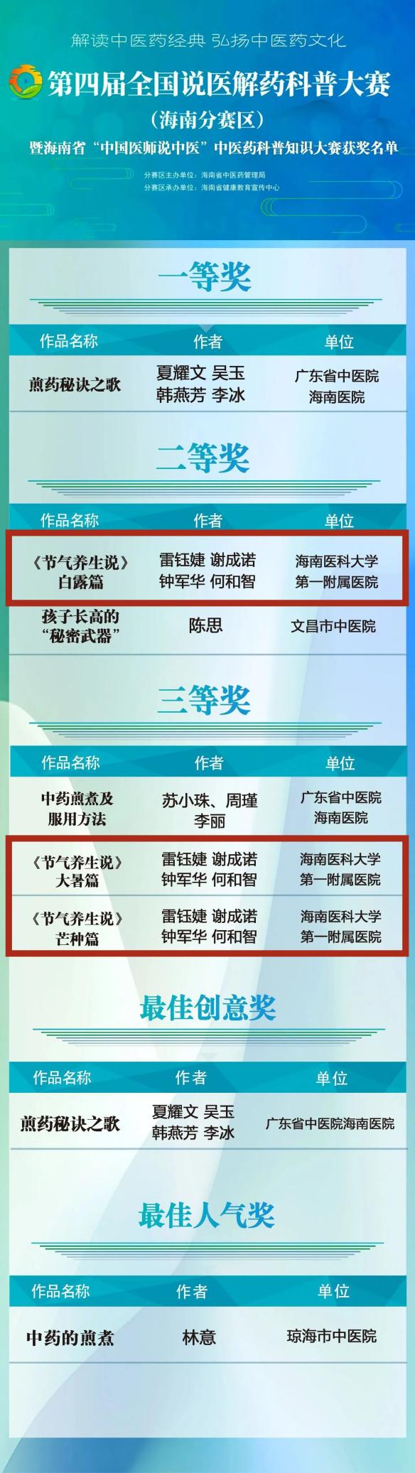 未来,第一附属医院将继续发挥中西医协同发展的专业优势,创作更多优质中医药科普作品,推动中医药文化深入大众、惠及民生,为传承精华、守正创新,助力“健康海南”建设贡献更大力量。
