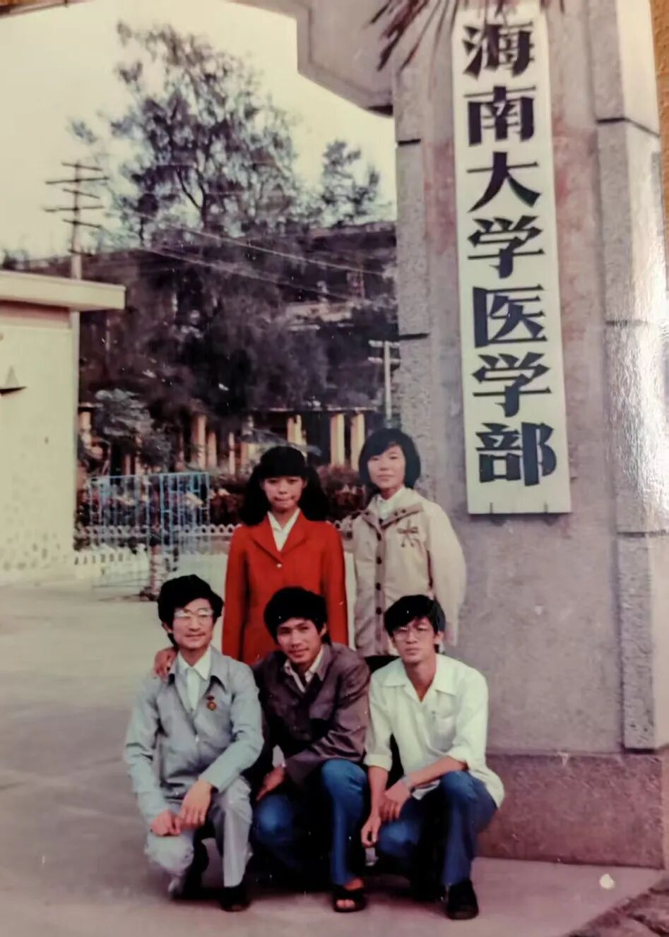 倡议发出的当晚(10月20日凌晨),李敏校友便率先传来喜讯,他在个人相册中找到了首张关键照片——五名学生在“海南大学医学部”门牌前合影,笑容灿烂,青春洋溢。这张照片成为首份被发现的、证实该时期校门面貌的关键影像,为寻档工作取得了至关重要的突破。