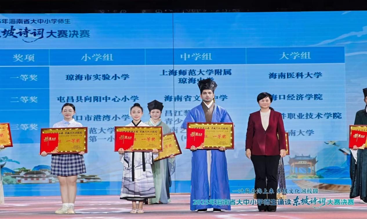 12月21日,2025年海南省大中小学师生诵读“东坡诗词”大赛决赛在华东师范大学澄迈实验中学圆满落幕。由我校马克思主义学院裴洲司、陈娇老师指导的留学生团队,凭借扎实的语言功底、创新的演绎形式与深刻的文化理解,荣获大学组一等奖,生动展现了我校党建引领文化育人的工作成效。