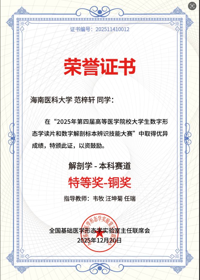 近期,第四届全国大学生医学形态学数字切片读片暨数字解剖标本辨识大赛总决赛在山东济南落幕。我校学子范梓轩跻身全国线下总决赛,斩获特等奖-铜奖,学校团队另获组织学赛道一、二、三等奖各1项,解剖学赛道一等奖1项、二等奖5项、三等奖3项,实现线上线下“双线告捷”。