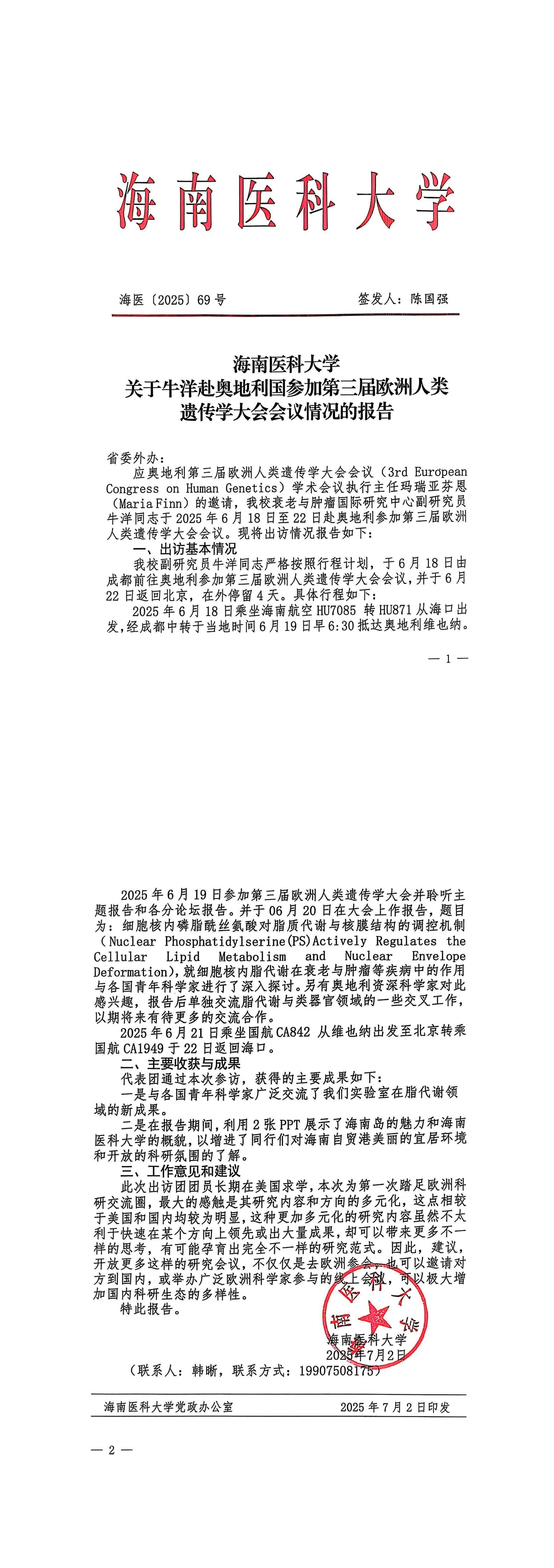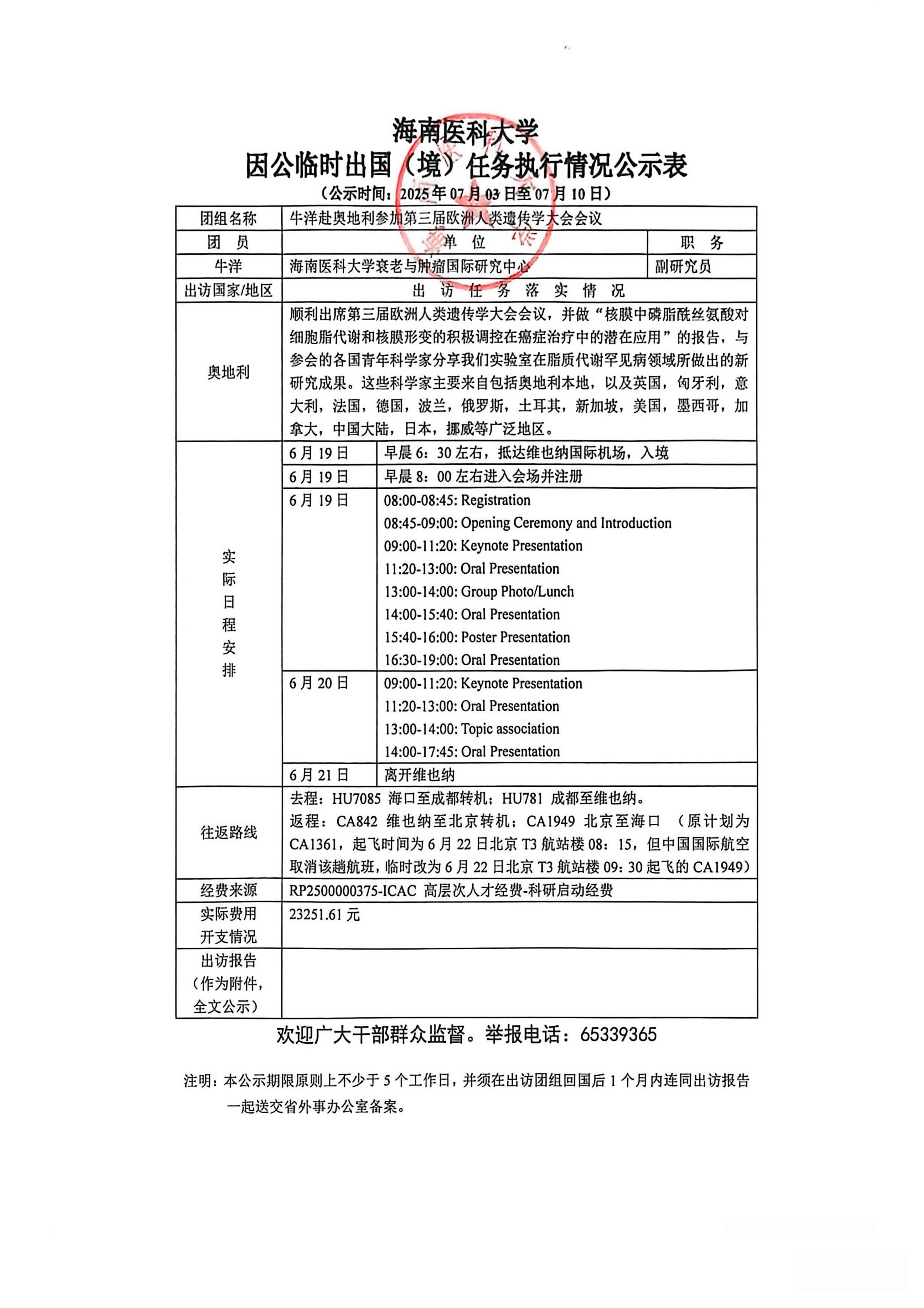 海南医科大学牛洋1人赴奥地利团执行任务公示表