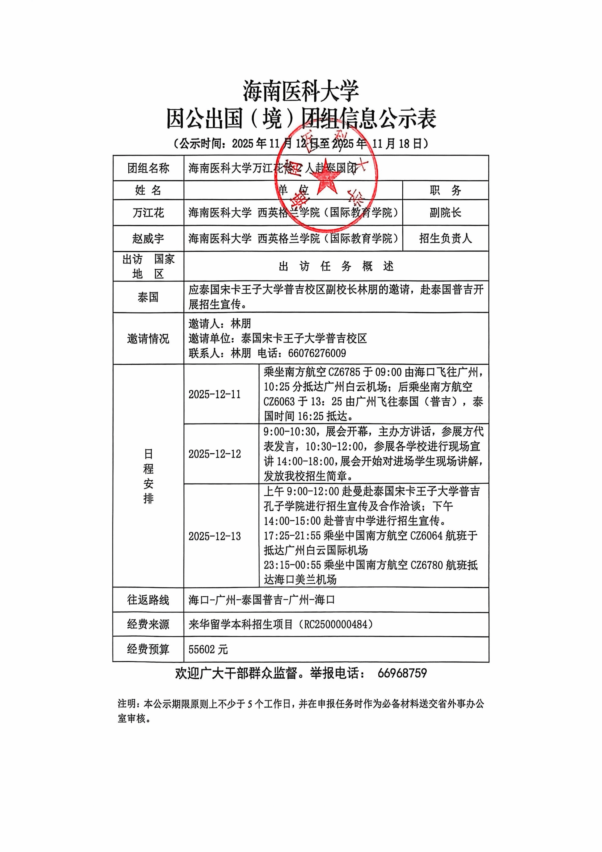 海南医科大学因公出国(境)团组信息公示 万江花2人赴泰国团
