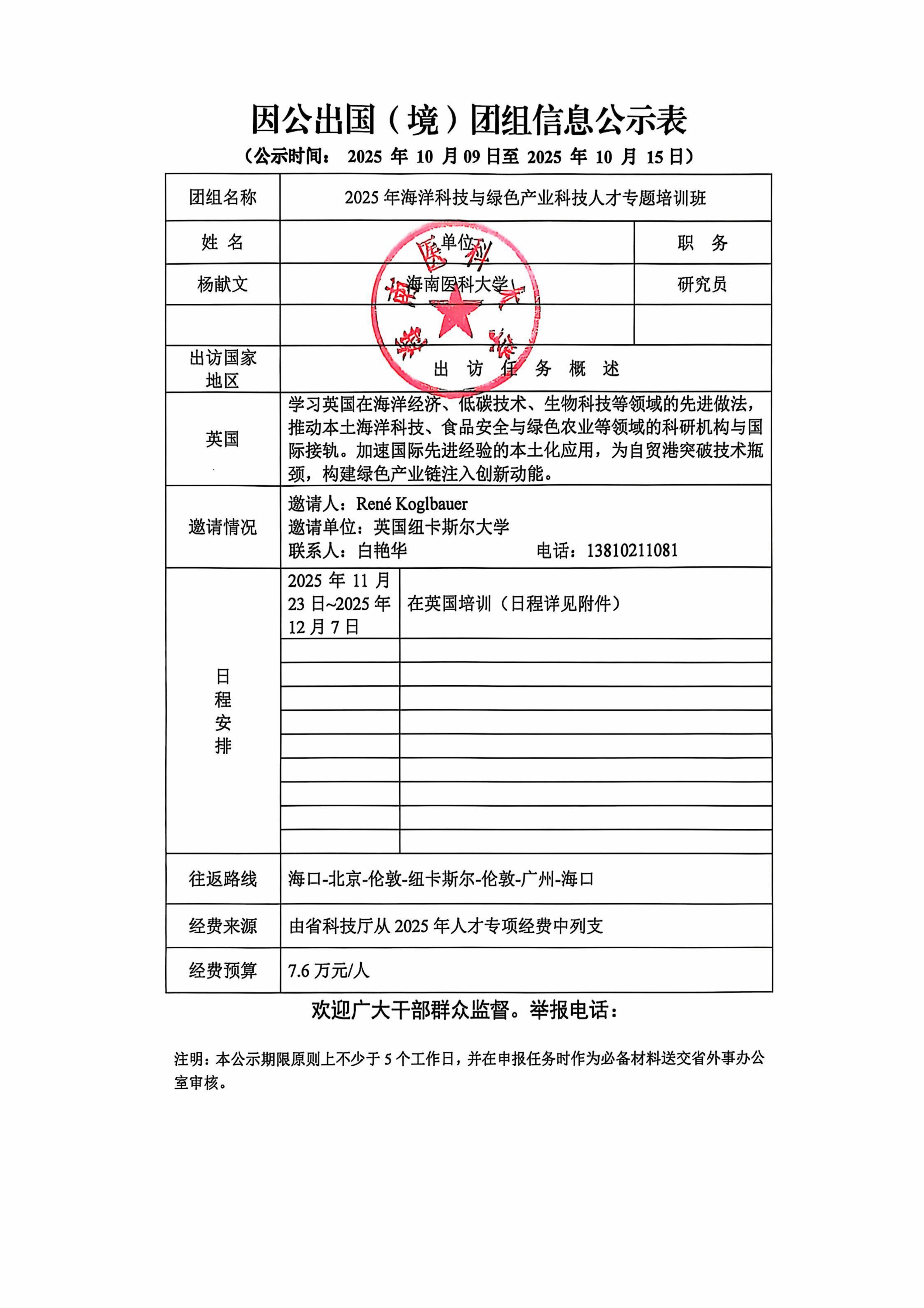 海南医科大学因公出国(境)团组信息公示 杨献文1人参加2025年“海洋科技与绿色产业科技人才专题培训班”团