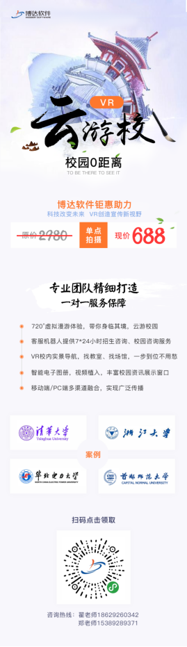 博达软件面向全国高校推出VR“云游校”系统,它是基于VR技术为高校提供招生,校庆,对外宣传展示的高端平台。可实现720°校容校貌全景展示,辅以语音、文字、图片、视频等,全方位展示校园风采(标志建筑、特色景观、图书馆)、校园文化(校训、荣誉、学校环境)、办学特色(实验实训室、校史馆)等。让用户虽“远在天边”,却有如置身校园中产生“身临其境”之感。