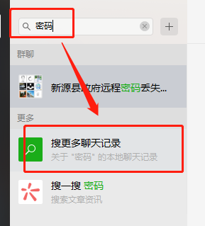 1) 在微信中,搜索:远程、密码、账号 关键字,搜更多聊天记录: