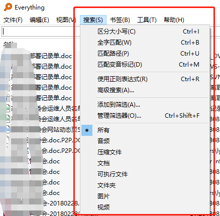 1、 运行Everything,点击【搜索】--进行如下设置: