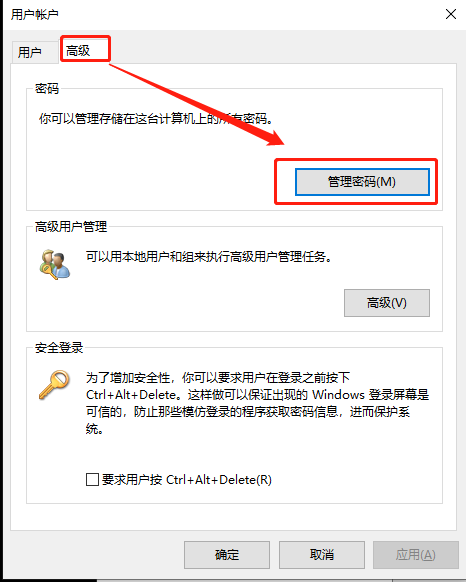 2)下面会出现“用户帐户”对话框,单击其中的“高级”—“管理密码”