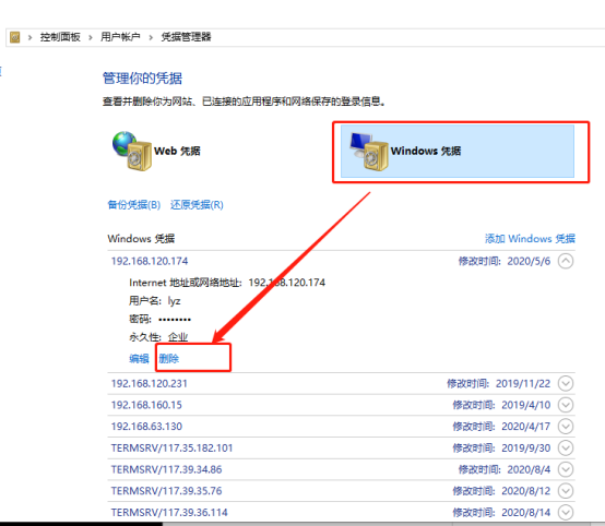 3)选择“Windows”凭证,可以看到已记录的远程桌面信息