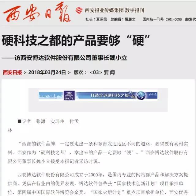 3月24日,西安日报第三版刊出魏总专访文章--《硬科技之都的产品要够“硬”》。文章中,魏总讲述了博达的创业故事和发展历程,更以交大学子和陕西创新创业者身份,讲述了自己是如何受“西迁精神”感召,立足家乡,扎根陕西,和自己的创业团队一起,靠硬邦邦的产品和不忘初心、艰苦奋斗的实干精神让博达走出陕西、走向全国,为家乡建设和陕西信息产业发展贡献绵薄之力!