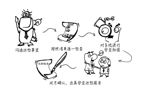 安全巡检工作因面向客户众多,涉及的检查及协调沟通工作繁杂,为最大限度减少巡检工作过程中可能出现的失误和遗漏,从一开始就建立了1个客服搭档1个安全部署人员的高效组合,他们的工作基本遵循这样的流程: