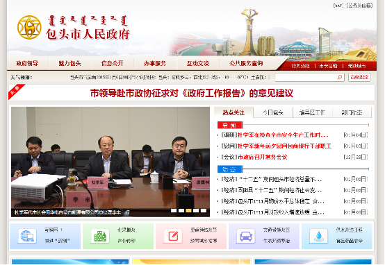 包头市人民政府网站是集信息传播、在线服务、互动交流等多种功能为一体的综合性门户网站。网站建设坚持“信息公开透明,服务市民办事需求,畅通政民互动渠道”的基本方针,集成了“信息公开”“政策解读”“行政审批”“办事服务”“快速查询”“在线访谈”等内容,设置设计新颖、内容丰富、特点鲜明,为市民提供了多项场景化、定制化的服务,着力构建市民的网上办事大厅、包头市阳光政务平台。