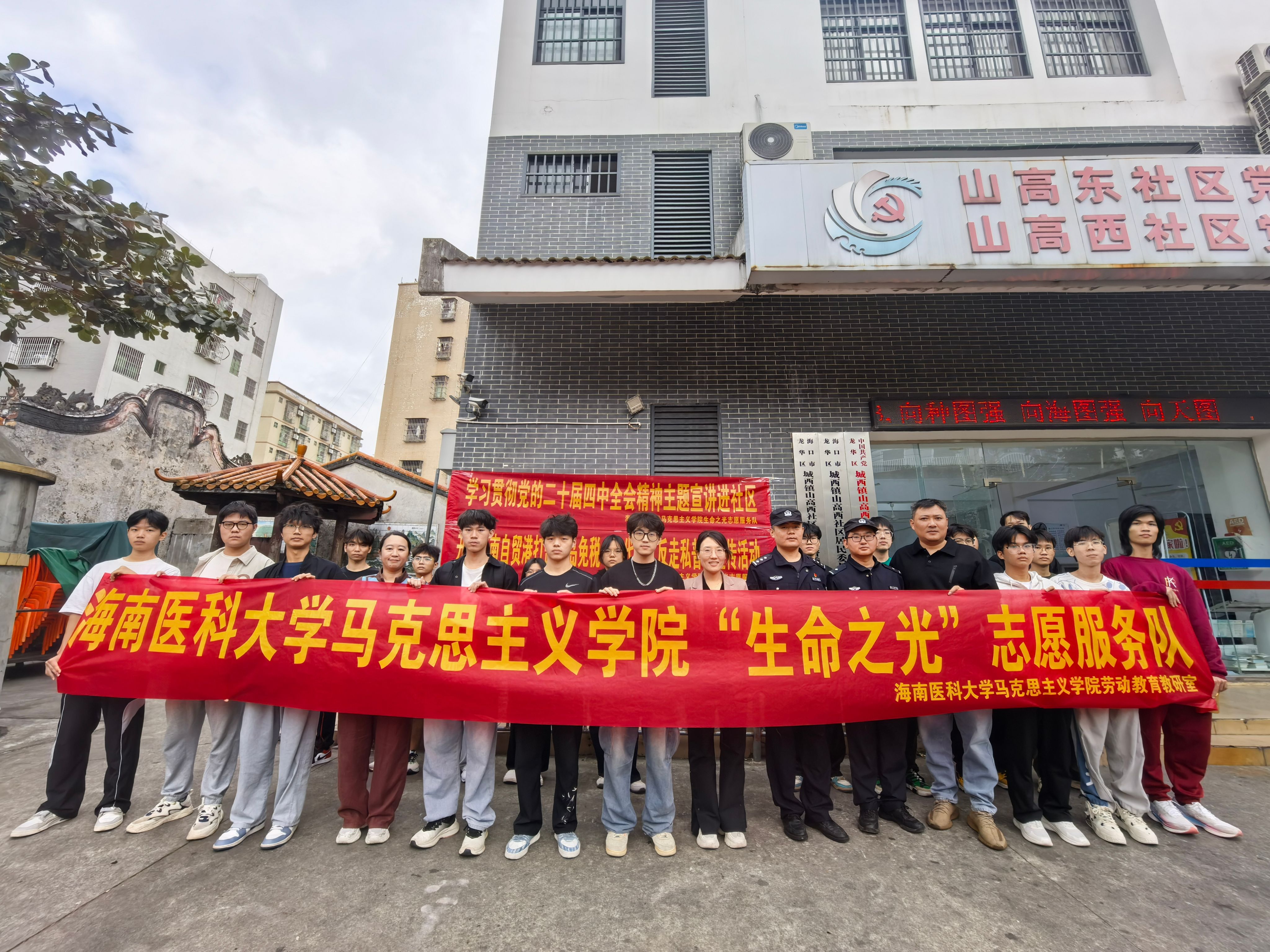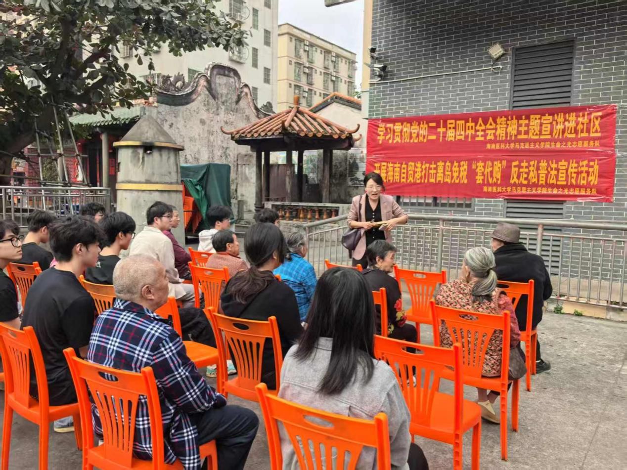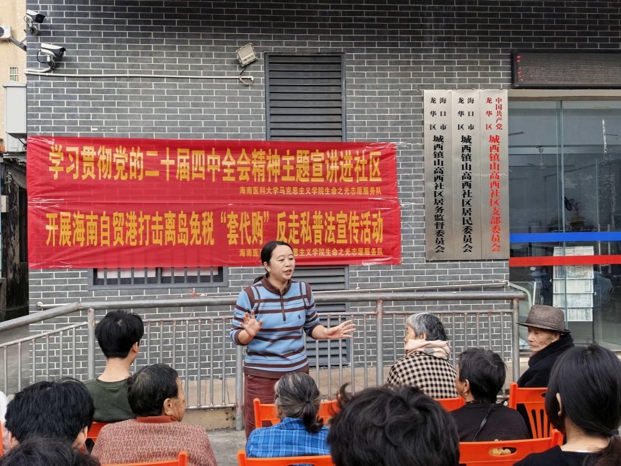 为推动党的二十届四中全会精神在基层落地生根,筑牢海南自贸港反走私法治防线,12月22日,海南医科大学马克思主义学院教师马黛丹、范琼带领学生志愿者走进海口市山高社区,联合辖区派出所共同开展党的二十届四中全会精神解读和“套代购”反走私普法专题宣讲活动,以“理论+法治”双轮驱动的形式,为社区居民送上通俗易懂的精神滋养与法律保障。