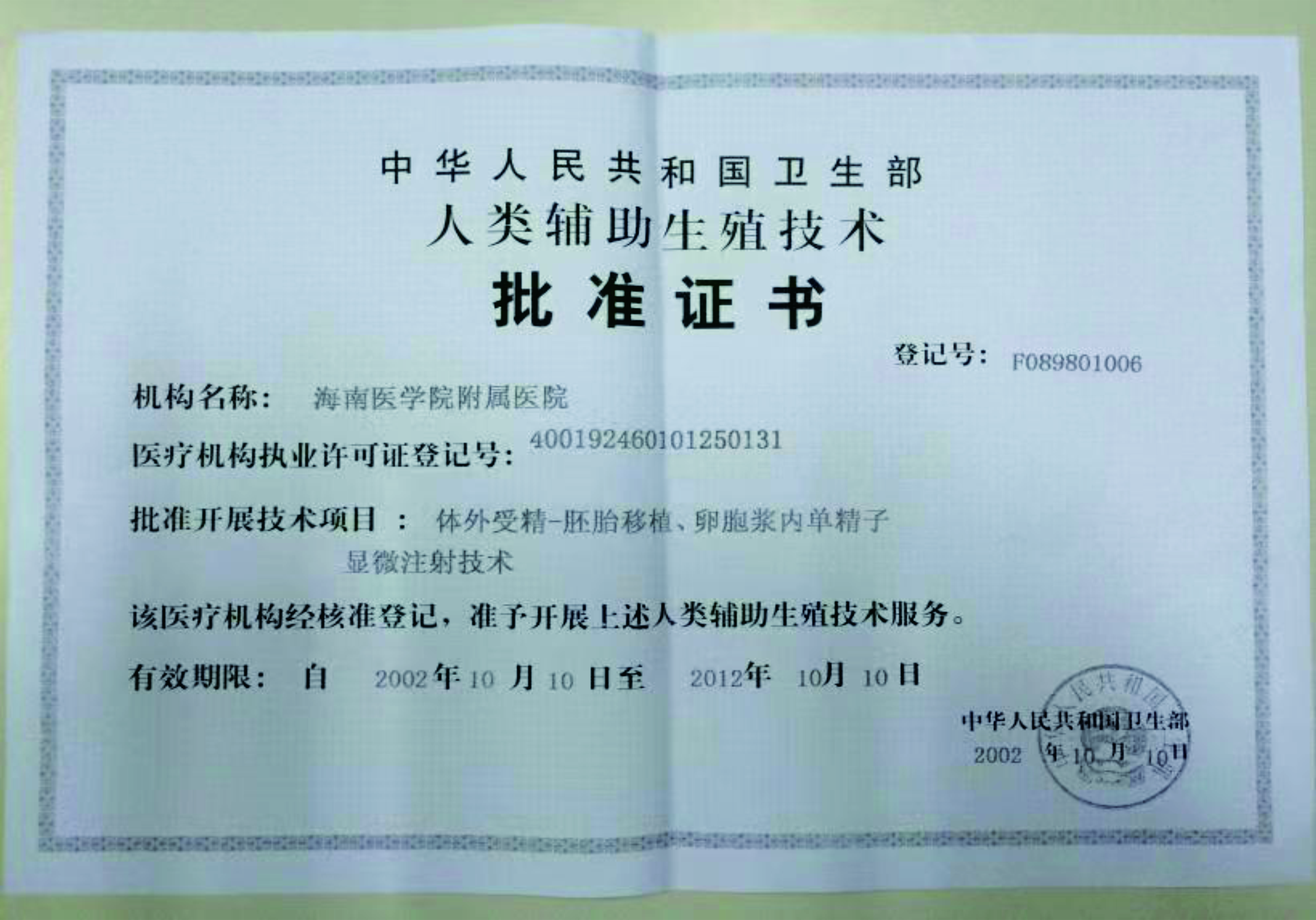 2002年10月,卫生部批准附院为海南省内唯一获准开展人类辅助生殖技术的医疗机构,附院成为全国首批8家获准开展人类辅助生殖技术的单位之一。