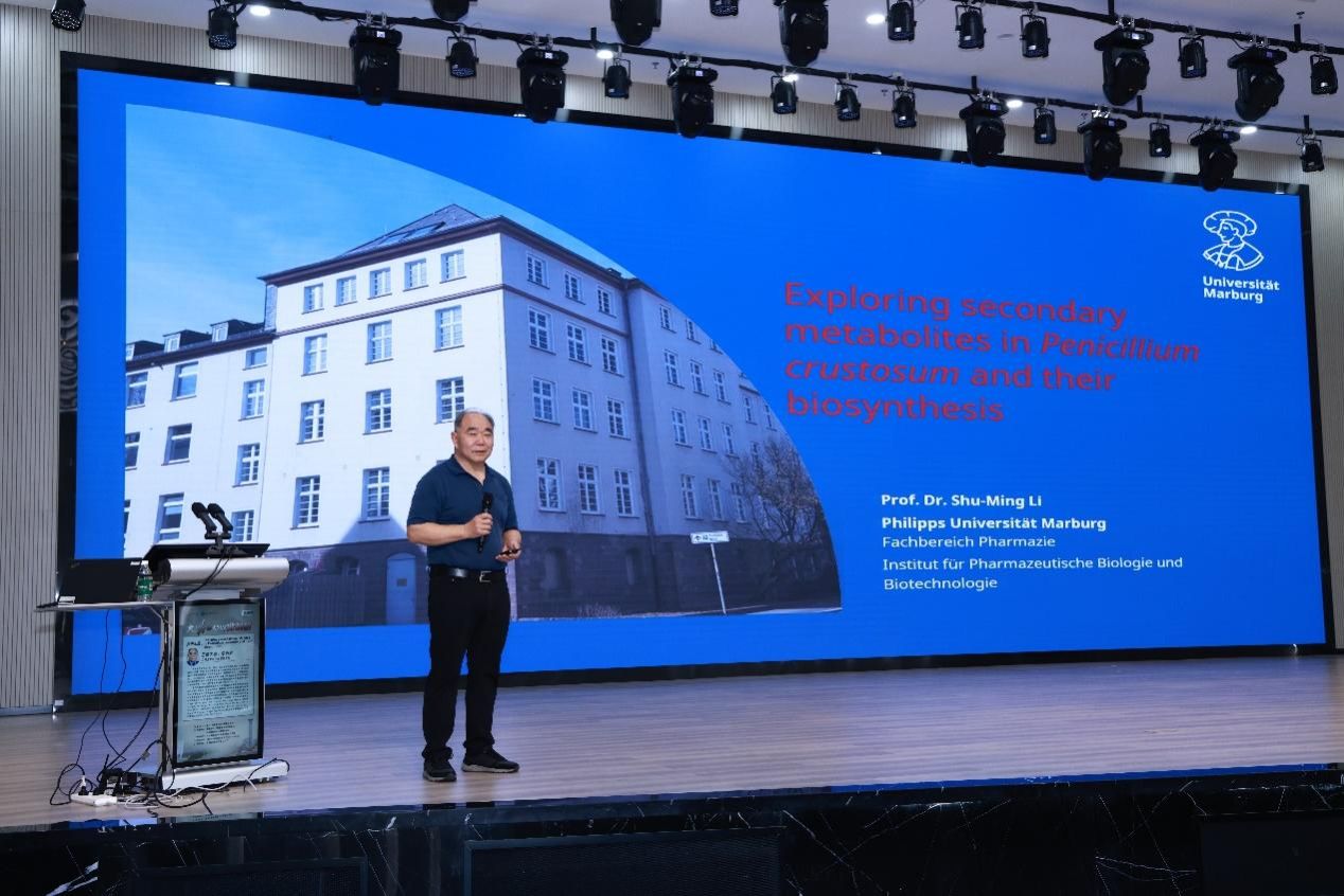 报告中,李书明教授围绕天然产物次生代谢产物生物合成的研究思路与实验方法进行系统分享。他指出,天然产物在抗肿瘤、抗感染药物研发中具有重要价值,当前新天然产物挖掘的核心瓶颈在于“实验室条件下微生物多数次生代谢相关基因呈沉默或低表达状态”,可被检测与利用的产物十分有限。他以南极海洋来源的Penicillium crustosum为研究范例,详细介绍了融合培养条件优化、调控因子激活、基因组挖掘等新技术与13C同位素标记等传统方法的综合研究策略。团队通过解析该菌株的次生代谢途径,发现了非酶催化反应介导立体构型转变的关键机制;通过激活菌株沉默基因簇并结合成熟宿主系统进行异源表达,成功发掘出多个具有重要研究价值的代谢产物。依托基因敲除、生化验证等多种实验手段,团队不仅完整阐明了目标化合物的生物合成途径,还揭示了一系列关键合成酶的催化机制。该技术体系还可广泛用于真菌代谢产物的深度机制研究。