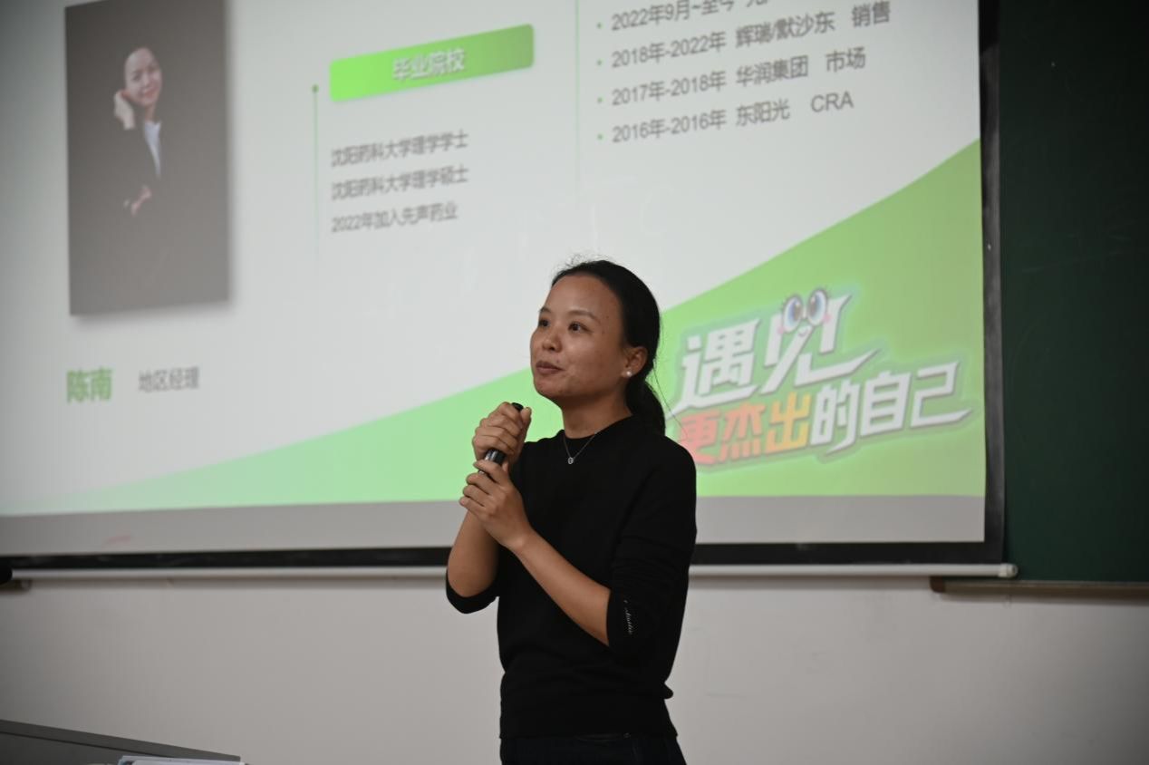 接着,先声药业也邀请到药学院2020届毕业入职先声药业的学姐作为优秀校友,来向各位学弟学妹分享经验。她分享了自身入职基层的经历,在工作中克服的种种困难,从而使自身的能力得到进步,在自己一步步地努力中,岗位也在不断晋升。通过她自己的亲身经历总结出来的经验,告诉了还未步入职场的同学们应该如何让自己更快地融入工作环境。