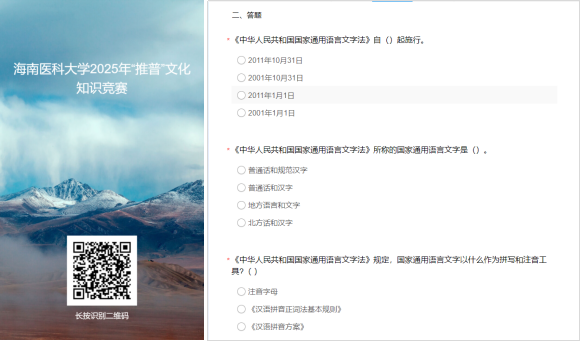 9月23日至27日,“推普”文化知识竞赛拉开帷幕。依托“问卷星”小程序搭建答题系统,以“规范语言文字+传承文化精神”为核心,本次竞答设置了25道题目,内容涵盖语言文字政策法规、普通话知识、规范使用汉字、文学常识、红色知识等方面。既聚焦语言文字规范能力的“精准提升”,又突出了文学和红色知识对价值认同的“深度引领”。
