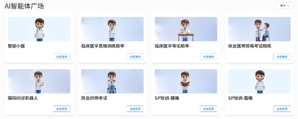 引入多个医学教育大模型服务互动教学、自主学习,建设AI智能体广场,打造《临床医学导论》《神经系统疾病》《智能医学工程导论》等主要课程的AI化并常态化应用于教学。